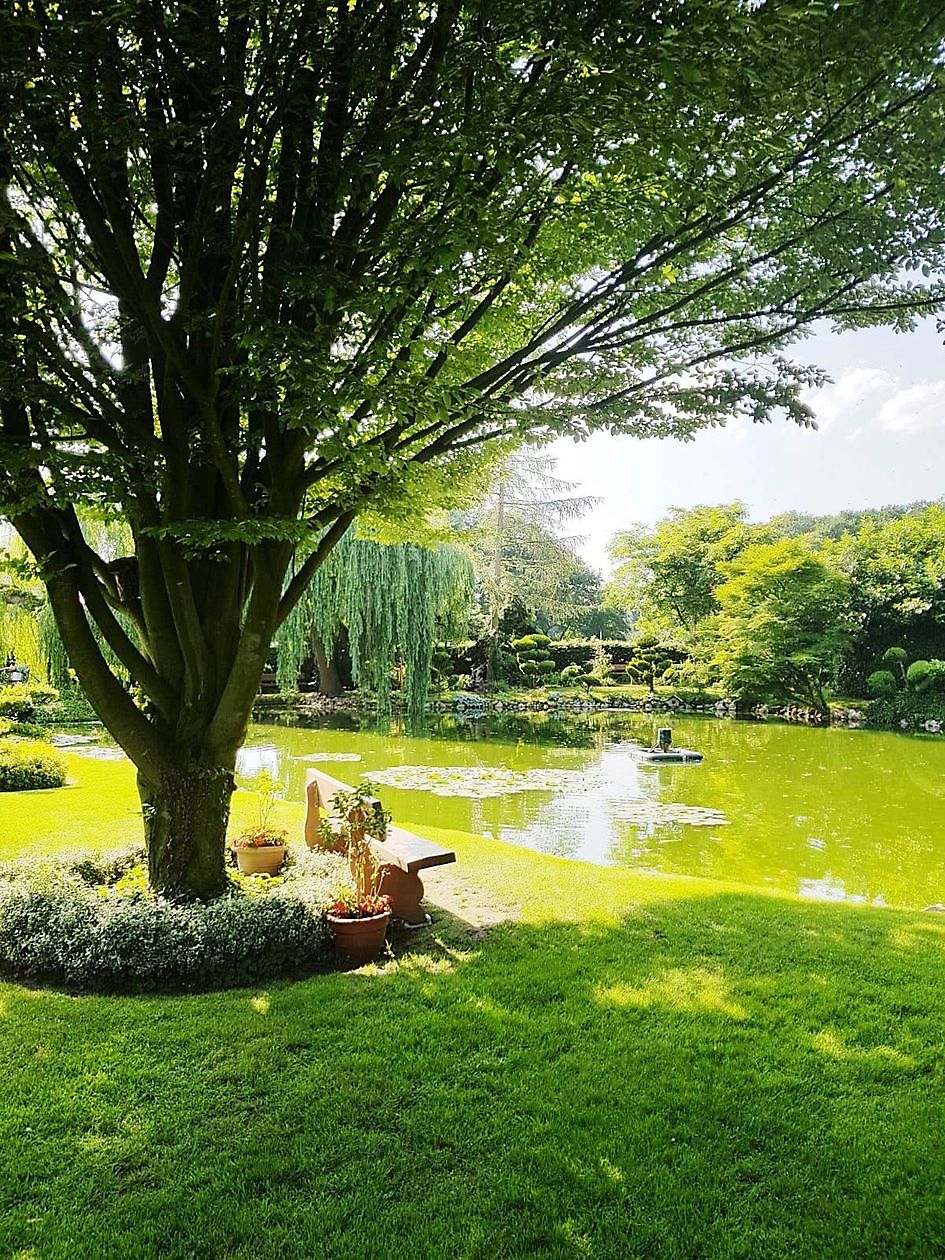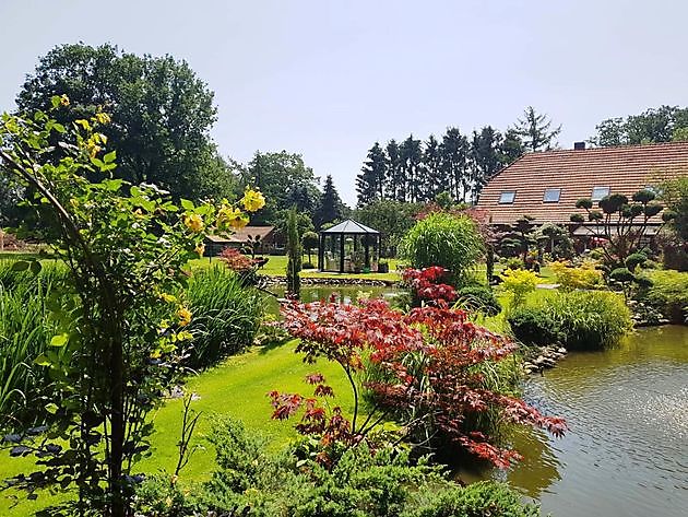 De tuin is een voormalige ca. 1,7 hectare grote boerenplaats met oude bomen, incl. ongeveer 1 ha wildpark. Belangrijkste kenmerken zijn de verschillende vijvers met speelse elementen, bruggen en waterval, omringd door vormsnoei, esdoorns, hosta’s, hortensia's, grassen en een boomgaard met wilde bloemenweide. Verschillende zitjes nodigen u uit om nog even te blijven en te genieten van de zichtassen.
