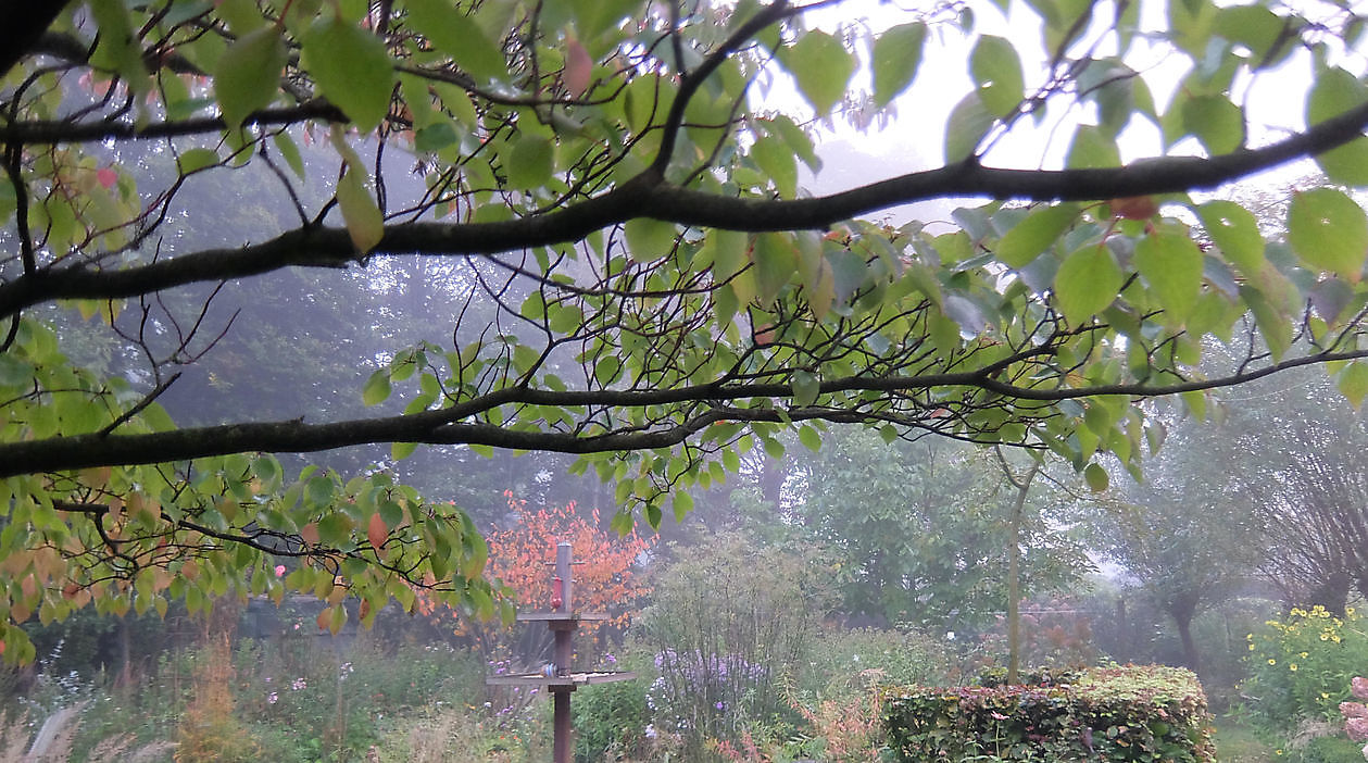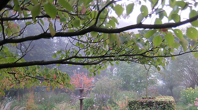 De tuin van ongeveer 1000 m2 bestaat uit kleurrijke borders gevuld met wilde planten, tuinplanten, rozen, struiken en bomen die samen goed gedijen in voornamelijk vochtige grond.