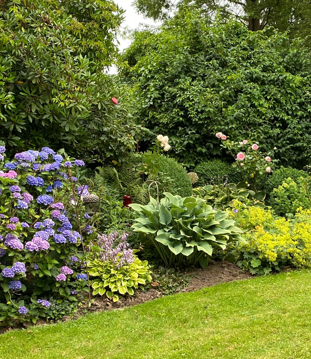 Eine Teichanlage, Staudenbeete, ein Gartenhaus und ein