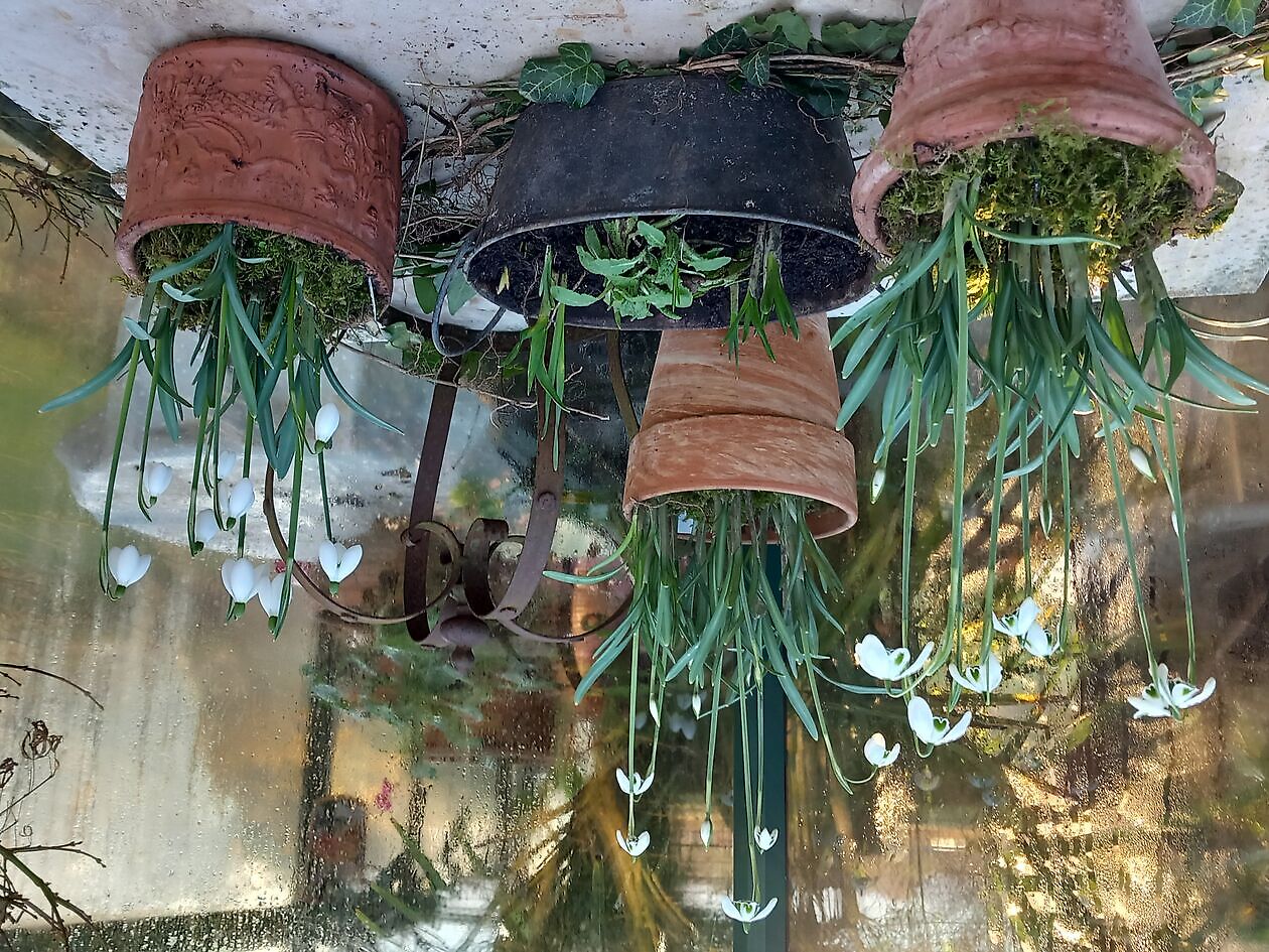 Dekorationen mit Schneeglöckchen und anderen Frühlingsblühern in Töpfen und Schalen sind überall im Garten zu entdecken.